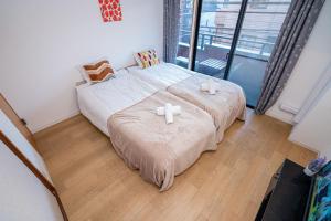 The apartment features two bedrooms, a living room with a flat-screen TV, and an equipped kitchen that includes a microwave and fridge. The bathroom has a shower and bidet, complemented by towels, bed linen, shampoo, soap, slippers, non-feather and hypoallergenic pillows. A washing machine is also available in the unit.