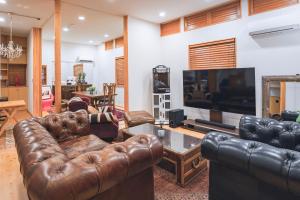 The fully air-conditioned unit features two bedrooms, a living room with a flat-screen TV and separate dining area, plus a kitchen equipped with a microwave, coffee machine, and refrigerator. The bathroom includes a bathtub with hair conditioner and slippers are provided. Guests benefit from linens, towels, cribs, high chairs, non-feather pillows, toothbrushes on site for convenience, and heating throughout.