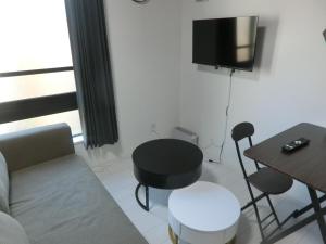 This one-bedroom apartment features a fully equipped kitchen with a microwave and refrigerator, alongside a dining area for meals. The living space includes heating, air conditioning, and seating designed for comfort. Entertainment is provided by a flat-screen TV with free Wi-Fi available throughout the apartment.