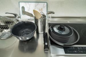 The apartment includes one bedroom and two bathrooms. It provides a fully equipped kitchen alongside a living area fitted with a flat-screen TV. Heating is also available within the unit.
