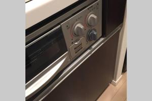 The apartment includes one bedroom and a bathroom equipped with both a bathtub and shower stall. The living area features a flat-screen TV, while the separate kitchen comes fully equipped with a microwave, fridge, washing machine, and kitchenware for self-catering needs.