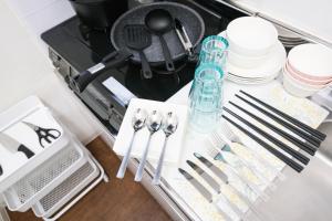 Chaque appartement dispose d’un balcon ou d’une terrasse offrant une vue urbaine. Les intérieurs sont équipés de la climatisation, d’une cuisine fonctionnelle avec ustensiles, ainsi que d’un espace repas. La salle de bains privative comprend une baignoire et une douche, accompagnées de chaussons et d’un sèche-cheveux. Certains logements proposent également un coin salon avec canapé-lit pour plus de confort.