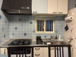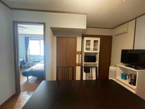 The apartment features a private entrance leading into a space with air conditioning and tatami flooring. Guests will find a flat-screen TV, wardrobe, fan, and non-feather pillows in the sleeping area. The fully equipped kitchen includes a microwave, toaster, stovetop, kitchenware, and an electric kettle.