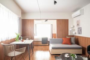 Each unit at Mont Chateau Nakano Philosophy Hall includes air conditioning, heating, and a private bathroom equipped with shampoo, conditioner, towels, and a hairdryer. The kitchen contains essential appliances such as a microwave, fridge, stovetop, kitchenware, and an electric kettle. The living area features a sofa bed for additional seating or sleeping space.