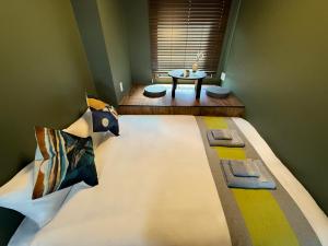 Guests enjoy modern amenities like a flat-screen TV with streaming services and individual temperature control for air conditioning. Practical features include a washing machine within the unit, clothes rack at entryway, wardrobe for storage, key card access for security alongside smoke detection systems and fire extinguishers. The property maintains smoke-free rooms throughout and accepts cashless payment methods.