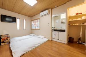 The apartment includes air conditioning and heating for climate control. Inside, guests will find a living area with a sofa bed alongside tatami flooring. The fully equipped kitchenette features kitchenware, a stovetop, microwave, and fridge. A private bathroom provides toiletries such as shampoo, toothbrushes, towels, a hairdryer, and options for either a bathtub or shower.