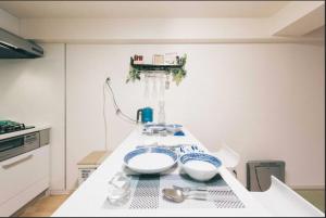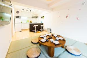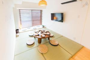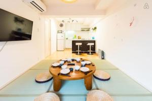 Inside, the apartment includes air-conditioning throughout, parquet and tatami flooring, and soundproofing for added privacy. The kitchen is equipped with essential appliances including a stovetop, microwave, refrigerator, electric kettle, and kitchenware. Guests can enjoy meals at the dining table or relax in the seating area while watching TV. The bathroom provides both bath and shower options along with free toiletries and a bidet.