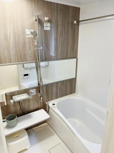 The air-conditioned apartment features a living room with a sofa and flat-screen TV, alongside a fully equipped kitchen that includes a dishwasher, coffee machine, refrigerator, and electric kettle. The private bathroom contains a hot tub, shower, slippers, toothbrush kit, conditioner, and an emergency cord for safety. Guests can enjoy free Wi-Fi throughout the apartment.