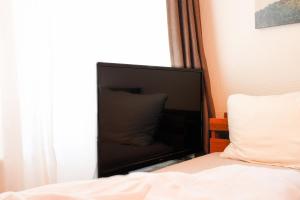 The apartment features air conditioning and heating with a tile or marble floor throughout. The living room contains a flat-screen TV with streaming services for entertainment, alongside free Wi-Fi available in the lounge area and all public spaces. The fully equipped kitchen includes a microwave, refrigerator, electric kettle, tea and coffee maker, as well as kitchenware. The private bathroom provides slippers, conditioner, a washing machine, and non-feather pillows are provided for added comfort.