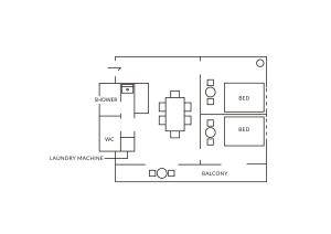 This two-bedroom apartment includes a fully equipped kitchen with a microwave and fridge, alongside a washing machine for added convenience. The bathroom provides slippers and a hair dryer. Guests enjoy private entry to the unit, while the seating area features heating and a sofa.